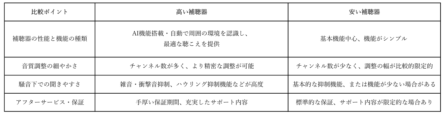 補聴器の価格帯は広く、「高い補聴器」と「安い補聴器」で何が違うのでしょうか。価格差は主に搭載機能、音質調整の細やかさ、サポート等に現れます。その主な違いを解説します。
