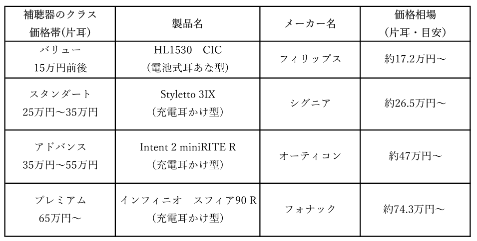 補聴器の価格は性能や機能と深く関連しています。ここでは価格帯別に注目される補聴器の例を挙げ、その特徴を紹介します。ご自身の予算や求める聞こえに合う補聴器選びの参考にしてください。ただし、最適な一台は専門家との相談と試聴で決まります。以下に、価格帯別の代表的な補聴器の例(片耳の目安価格)をまとめました。実際の価格は販売店や時期により異なる場合があります。